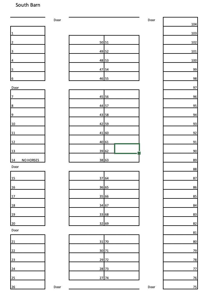 SOUTH BARN (OUT BACK DOOR WHERE YOU GO IN ARENA) DIRT STALLS (1-75)